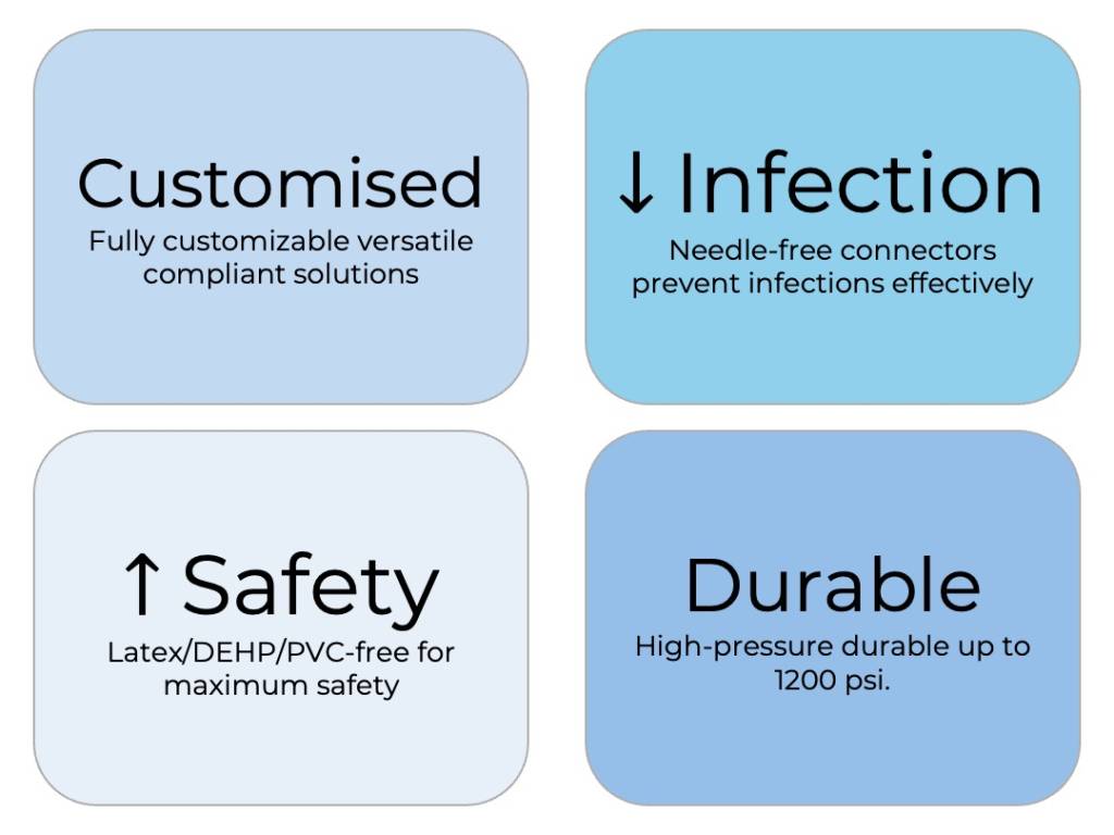 - Infection Control — Needle-free/closed systems, sterile packaging, lipid-resistant, MRI-compatible options.